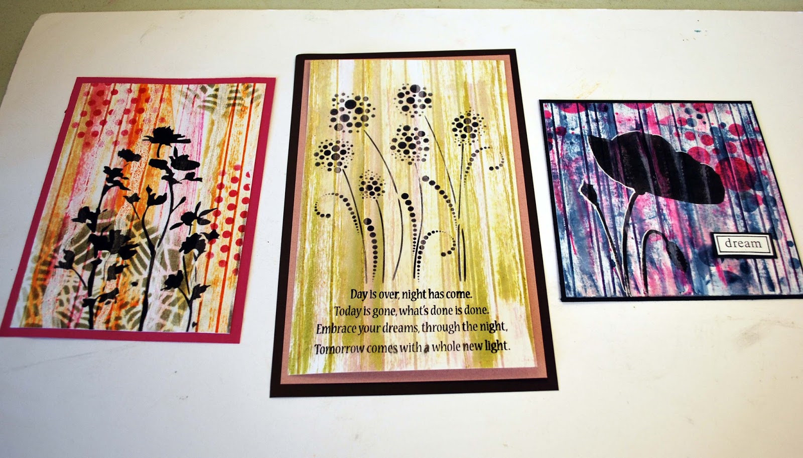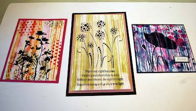 When the card stock is dry ( I did not use a heat gun because of the embossing) tape the stencil down firmly, with low tack stencil tape and stencil the image using black ink. I found Black Stazon worked well for this and I also blended some around the edges too.