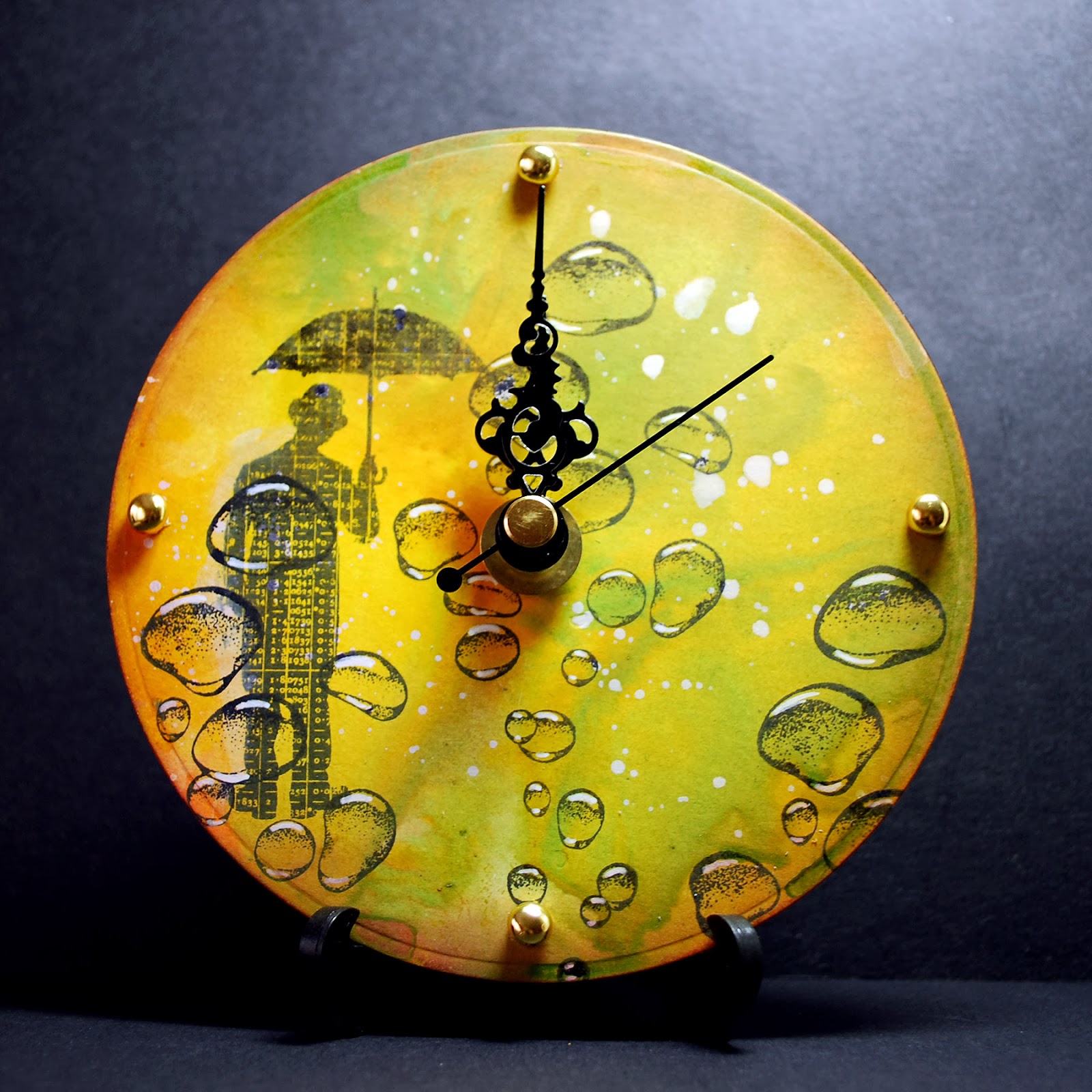 So.... here is a clock with a Distress inks and water splattered background, a Tim Holtz Umbrella Man Stamp ( love him... and the stamp!) plus the beautiful Rising Bubbles Stamp from Designs by Ryn.